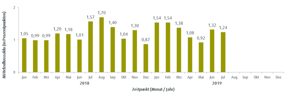 Veränderungen der Mittelzuflüsse und Mittelabflüsse werden über den Fundflow-Faktor ausgedrückt. Dabei werden die monatlichen Mittelzuflüsse des Berichtszeitraums in Relation zu den monatlichen Mittelabflüssen gesetzt. Bei einem Fundflow-Faktor über eins überwiegen die Mittelzuflüsse, bei einem Fundflow-Faktor unter eins die Mittelabflüsse.