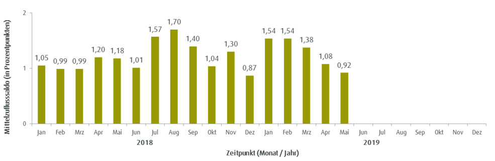 Veränderungen der Mittelzuflüsse und Mittelabflüsse werden über den Fundflow-Faktor ausgedrückt. Dabei werden die monatlichen Mittelzuflüsse des Berichtszeitraums in Relation zu den monatlichen Mittelabflüssen gesetzt. Bei einem Fundflow-Faktor über eins überwiegen die Mittelzuflüsse, bei einem Fundflow-Faktor unter eins die Mittelabflüsse.