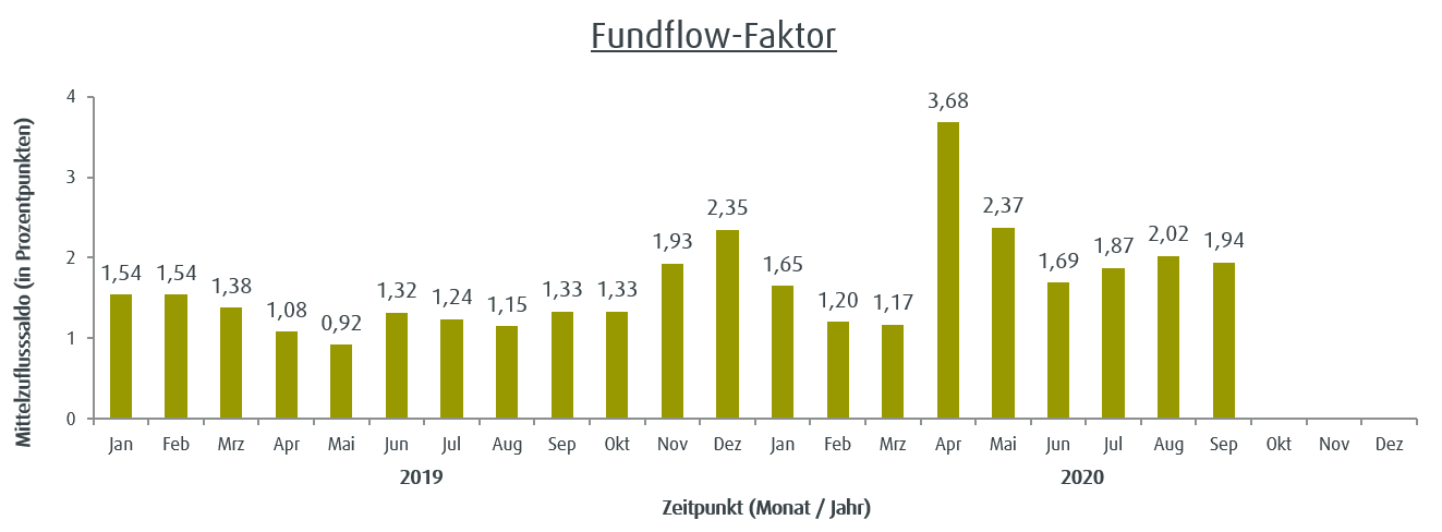 Veränderungen der Mittelzuflüsse und Mittelabflüsse werden über den Fundflow-Faktor ausgedrückt. Dabei werden die monatlichen Mittelzuflüsse des Berichtszeitraums in Relation zu den monatlichen Mittelabflüssen gesetzt. Bei einem Fundflow-Faktor über eins überwiegen die Mittelzuflüsse, bei einem Fundflow-Faktor unter eins die Mittelabflüsse.