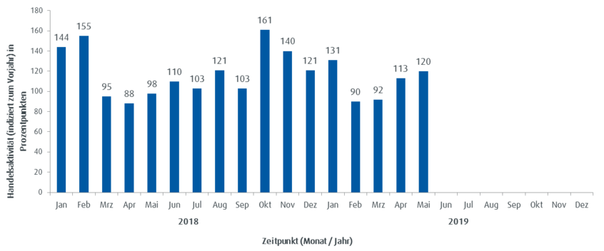 Die Handelsaktivität basiert auf dem Handelsvolumen und lässt unmittelbare Rückschlüsse auf den aktuellen Jahrestrend im Handel mit ETFs bei ebase Kunden zu. Ein Wert von über 100 steht für eine überdurchschnittliche Handelsaktivität der Kunden im Vergleich zum mittleren monatlichen Handelsvolumen des Vorjahres; ein Stand unter 100 zeigt eine unterdurchschnittliche Handelsaktivität an.
