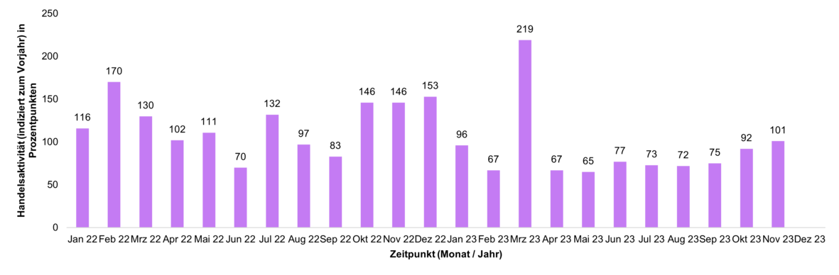 Die Handelsaktivität basiert auf dem Handelsvolumen und lässt unmittelbare Rückschlüsse auf den aktuellen Jahrestrend im Handel mit ETFs bei Kunden der FNZ Bank zu. Ein Wert von über 100 steht für eine überdurchschnittliche Handelsaktivität der Kunden im Vergleich zum mittleren monatlichen Handelsvolumen des Vorjahres; ein Stand unter 100 zeigt eine unterdurchschnittliche Handelsaktivität an.
