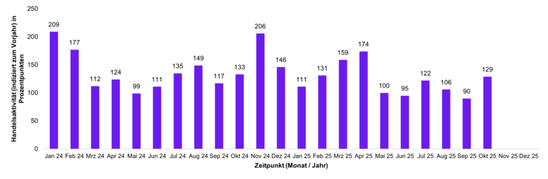 Die Handelsaktivität basiert auf dem Handelsvolumen und lässt unmittelbare Rückschlüsse auf den aktuellen Jahrestrend im Handel mit ETFs bei Kunden der FNZ Bank zu. Ein Wert von über 100 steht für eine überdurchschnittliche Handelsaktivität der Kunden im Vergleich zum mittleren monatlichen Handelsvolumen des Vorjahres; ein Stand unter 100 zeigt eine unterdurchschnittliche Handelsaktivität an.